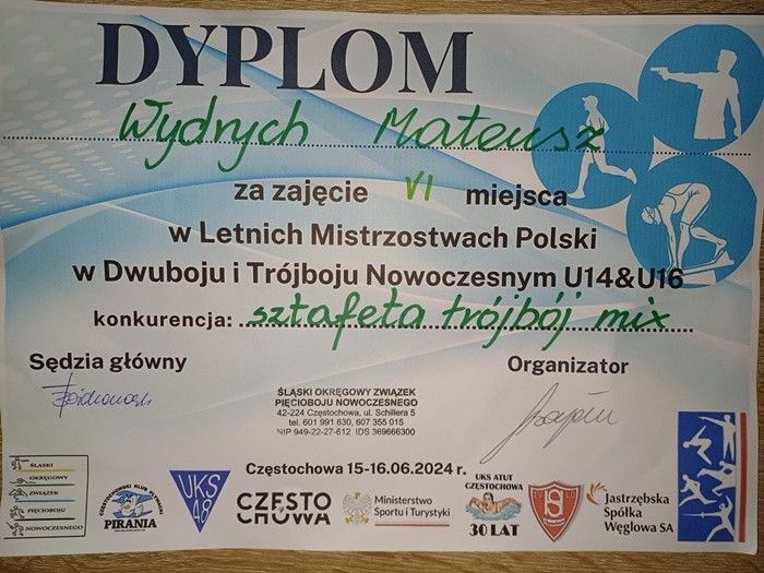 Uczeń naszej szkoły Mateusz Wydrych z klasy I TAR zajął VI miejsce w Letnich Mistrzostwach Polski w Dwuboju i Trójboju Nowoczesnym U14&U16, konkurencji: sztafeta trójbój mix.