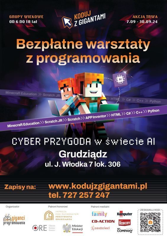 Grudziądz, 9 września 2024 r. - Giganci Programowania, czyli największa w Polsce szkoła programowania dla dzieci i młodzieży, ma przyjemność ogłosić start zapisów na 15. edycję darmowych warsztatów z programowania - Koduj z Gigantami. Od 7 września każdy może zapisać swoje dziecko do najnowszej odsłony wydarzenia, której tematem przewodnim jest hasło “Cyberprzygoda w świecie AI”.