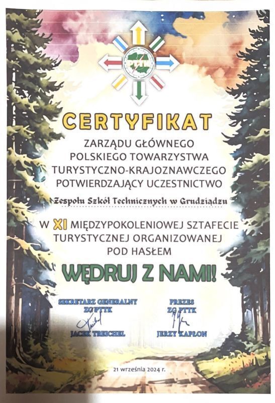 Podczas rajdu Zespół Szkół Technicznych otrzymał CERTYFIKAT potwierdzający uczestnictwo w XI Międzypokoleniowej Sztafecie Turystycznej organizowanej pod hasłem WĘDRUJ Z NAMI!