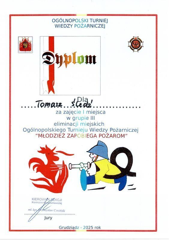 Tomasz Śledź zajął I miejsce w miejskich eliminacjach XLVII edycji Ogólnopolskiego Turnieju Wiedzy Pożarniczej pt. "Młodzież Zapobiega Pożarom"