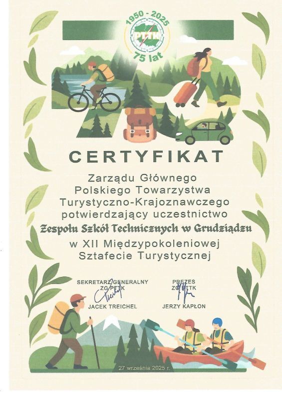 Podczas rajdu Zespół Szkół Technicznych otrzymał CERTYFIKAT potwierdzający uczestnictwo w XII Międzypokoleniowej Sztafecie Turystycznej.
