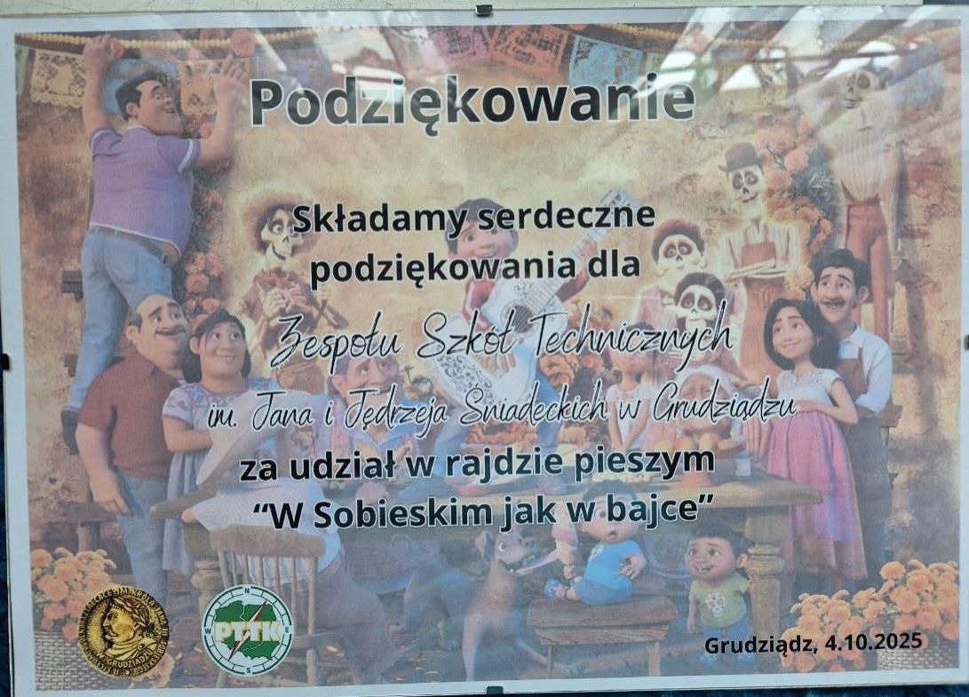 Dnia 4 października 2025 roku uczniowie naszej szkoły wzięli udział w Rajdzie Pieszym „W Sobieskim jak w bajce” zorganizowanym przez II Liceum Ogólnokształcące im. Króla Jana III Sobieskiego w Grudziądzu oraz Oddział PTTK im. ks. ppłk. dr. Władysława Łęgi w Grudziądzu.