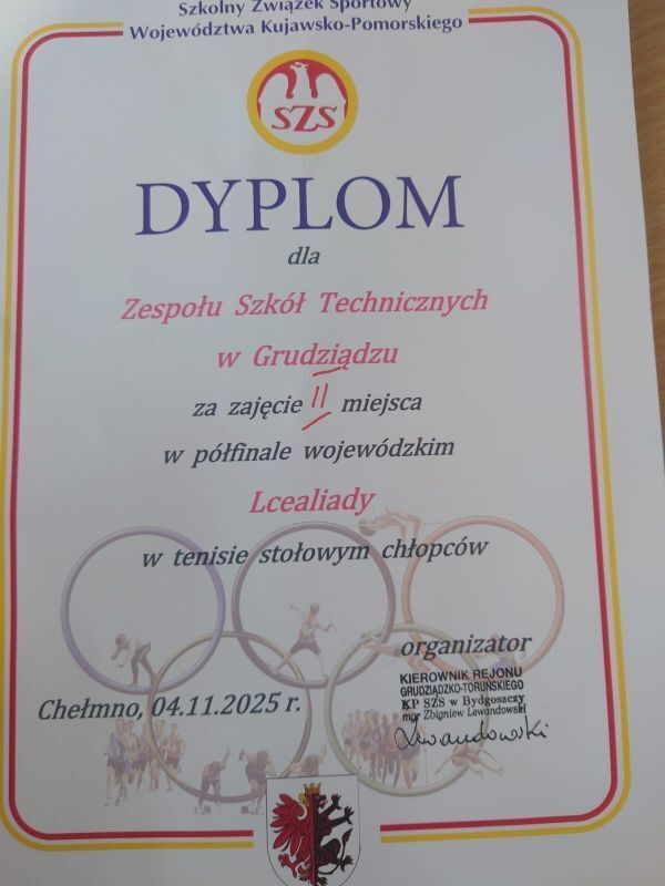 W dniu 04.11.2025r. nasi uczniowie Biernat Michał z klasy I TM, Biernat Kamil z klasy V Tel i Leszczyński Fabian z klasy I Tel uczestniczyli w półfinale Wojewódzkim Licealiady w tenisie stołowym chłopców. Po trudnej walce i przegranym meczu z LO Chełmno 3:2 zdobyliśmy II miejsce pokonując LO Tuchola 3:0 i LO Świecie 3:0. Serdecznie gratulujemy !
