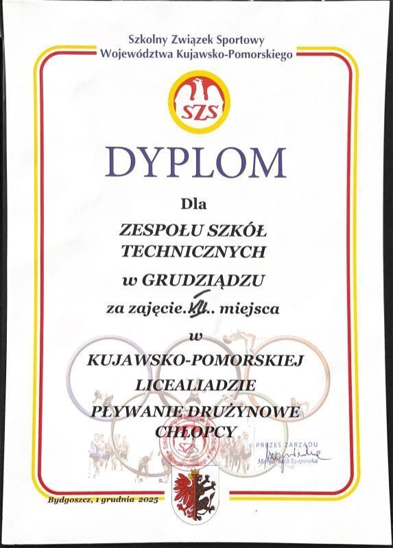 Dnia 1 grudnia 2025 roku uczniowie naszej szkoły wzięli udział w Kujawsko-pomorskiej licealiadzie w pływaniu, która odbyła się w Bydgoszczy - pływalnia Aqua Fordon ul. Kromera 11. W zawodach wzięło udział 14 szkół z województwa kujawsko-pomorskiego.