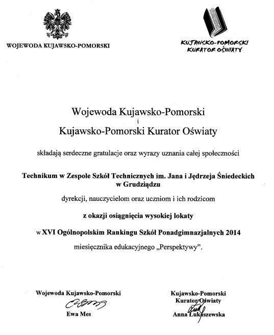 Technikum w Zespole Szkól Technicznych zajęło w nim bardzo wysoką 91-wszą pozycję w Polsce, a 4-tą w województwie. Zostaliśmy zaproszeni na to spotkanie jako jedyni ze wszystkich szkół ponadgimnazjalnych Grudziądza. Gratulacje i nagrodę z rąk Wojewody Ewy Mes i Kujawsko-Pomorskiego Kuratora Oświaty Iwony Waszkiewicz odebrali: