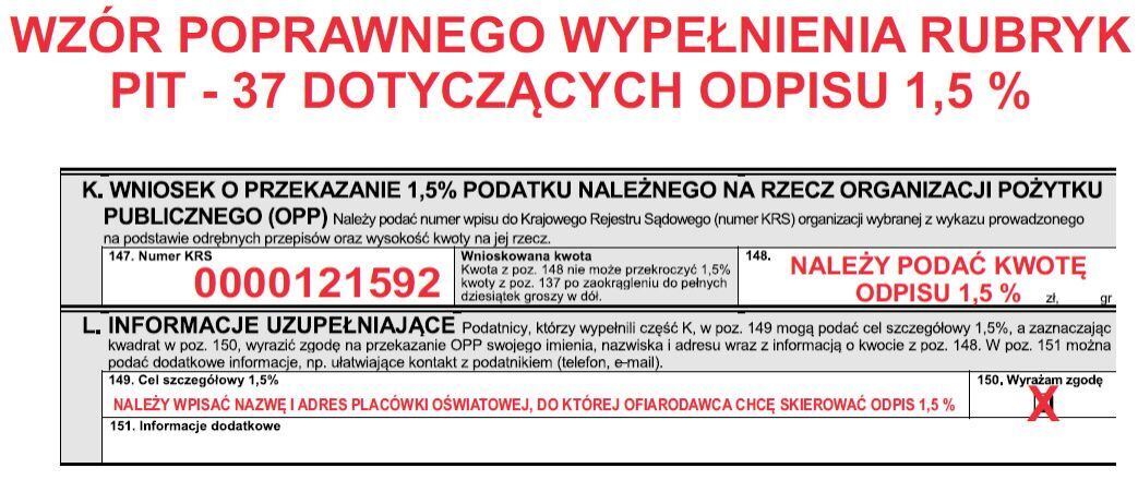 zwracamy się do Państwa z gorącą prośbą o skorzystanie z prawa do odpisania 1,5% od swojego podatku i przekazanie go na rzecz naszej szkoły i potrzeb jej uczniów.